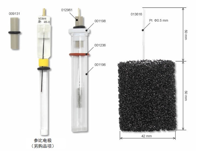 產品編號 品名 013647 SBC 整體電解用電化學池 內含品項 012632 試樣杯 (100 mL) 013616 PCE 多孔碳電極 012961 鉑對電極 23 cm 001198 對電極專用蓋 001196 對電極專用隔離室 001236 對電極專用 O 型環 009131 埠塞子 000178 攪拌子 013648 SBC特氟龍池蓋 ( 整體電解用 ) 010537 吹掃氣管 (ETFE), 1 m
